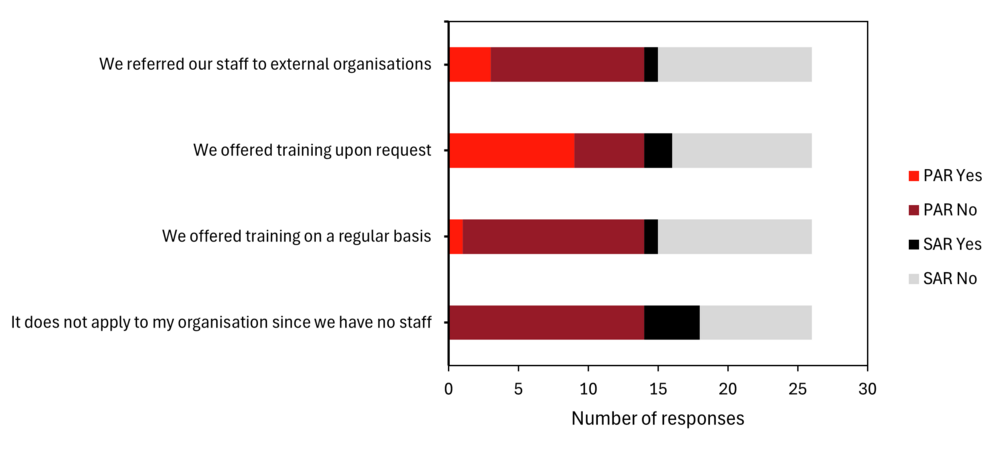 Increasing transparency goes hand-in-hand with encouraging staff to communicate openly and enabling them to improve their communication skills. Most PARs (10/14, 71%) offered media training or referred staff to external organisations for training. This is not common among SARs (only two provided training), possibly because some have no employees, but rather members who are professionally active in other organisations.