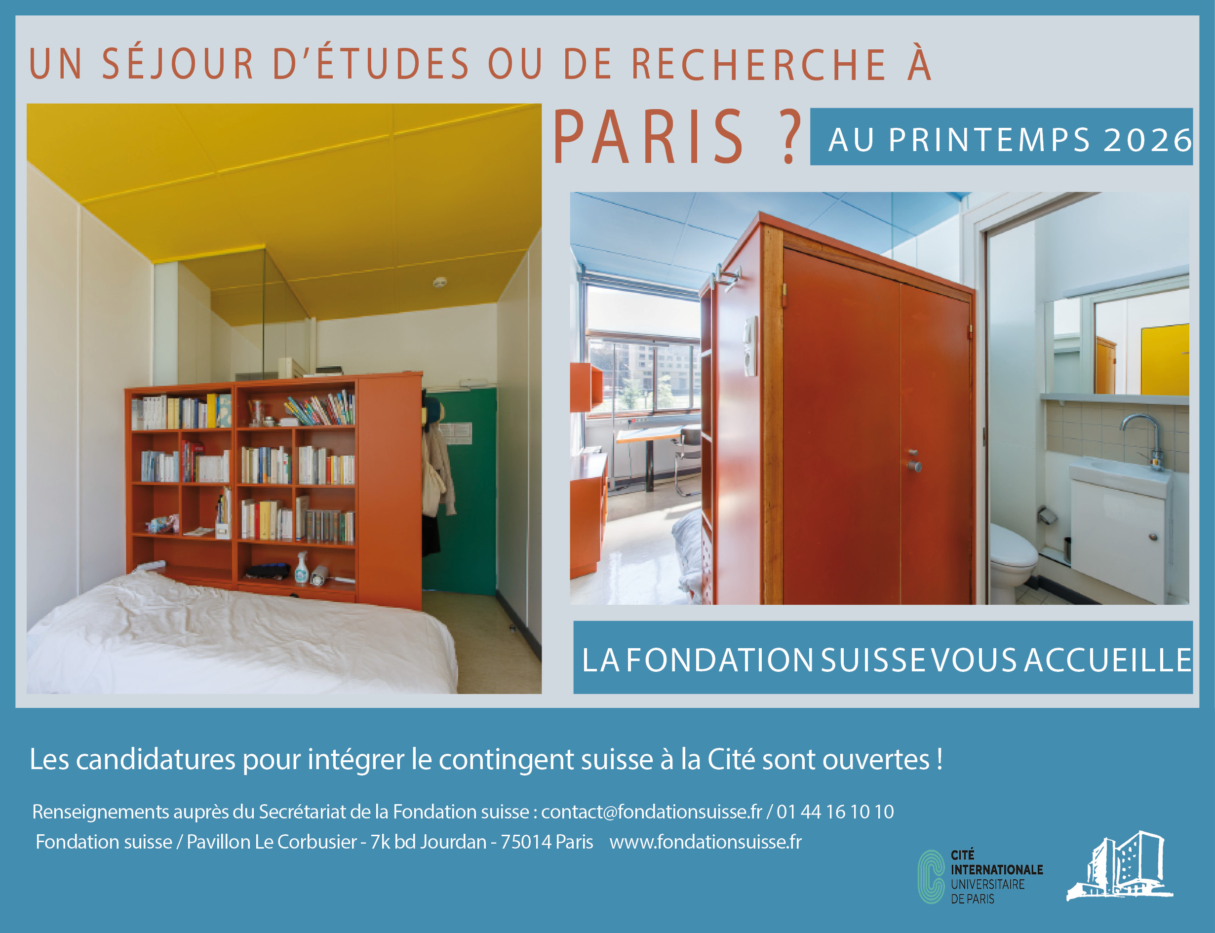Pour un séjour durant le semestre de printemps 2026, veuillez vous adresser directement au Secrétariat de la Fondation suisse à Paris par mail contact@clutterfondationsuisse.fr. La date limite pour les candidatures est fixé au 21 novembre 2025.
