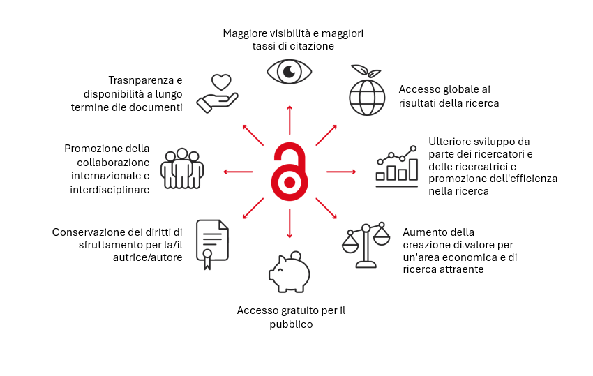 Maggiore visibilità per i ricercatori e le ricercatrici: I ricercatori e le ricercatrici possono diffondere più rapidamente e facilmente i propri risultati scientifici rispetto al passato. Questo aumenta la portata delle loro pubblicazioni. Di conseguenza, ottengono più rapidamente l'attenzione e la visibilità meritate sui propri temi. D'altro canto, anche loro beneficiano dell'accesso immediato, globale e gratuito ai risultati di ricerca dei loro colleghi.