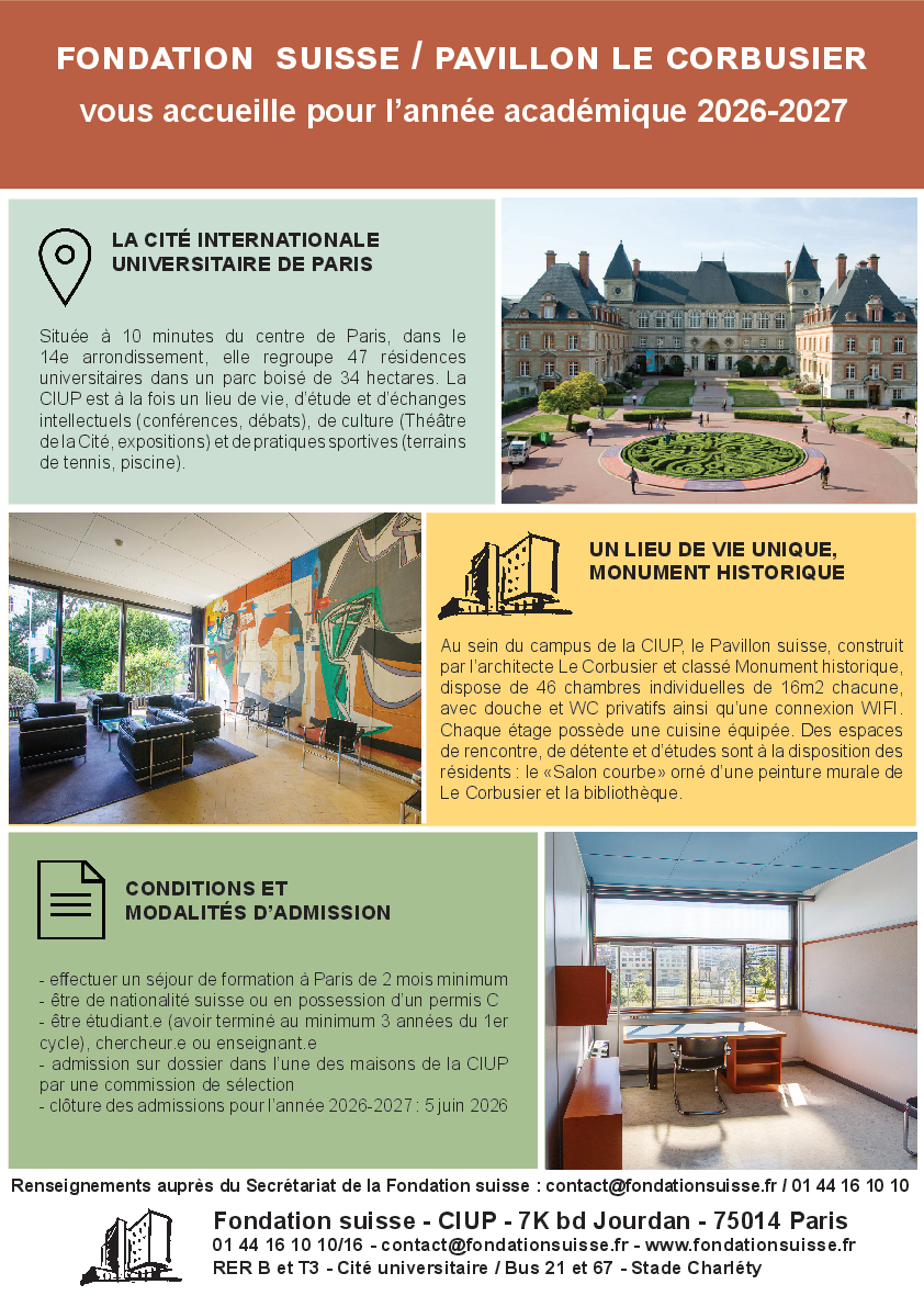 Die Fondation suisse ermöglicht Studierenden, Doktorierenden und Forschenden, die über die Schweizer Staatsbürgerschaft oder einen C-Ausweis verfügen, einen Aufenthalt in der Cité internationale universitaire de Paris (CIUP). Die Aufenthaltsdauer beträgt ein Semester oder ein Jahr (mit Verlängerungsmöglichkeit).